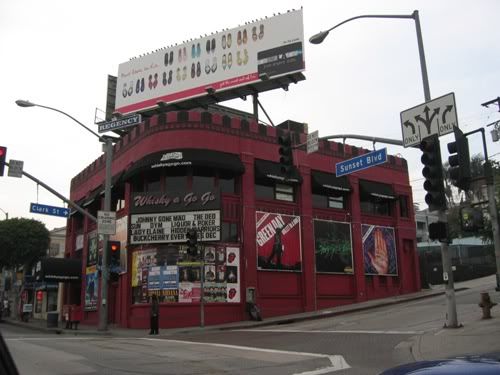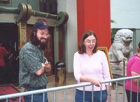 The Cemetery abuts the Paramount Studios, so we drove around the block and looked at their walls. Then we saw the big Hollywood sign - exciting, no? - and went over to Hollywood Boulevard to see some stars. We saw some stars on The Hollywood Walk of Fame. Word is that the stars must appear in person for the unveiling ceremony, so I'm a little curious how Godzilla's ceremony went. We saw Graumann's Chinese Theater, and a bunch of messed up concrete. I saw the original Star Trek cast's prints, and Marilyn's tiny footprints. I'm disappointed to have missed Douglas Fairbank's footprints (How did he do such great stunts with such little feet?). Did see a whole lot of other names I'd never heard of. And Johnny Depp's. Hmm, I bet I was standing on Fairbanks's prints when I was looking at Depp's. Anyway, this was where all the tourists were. There were a whole lot of touristy looking people. I tried not to fit in with this crowd, by not looking down. There were also a lot of celebrity impersonators standing by the street. By "impersonators," I mean people of nominally the same sex as, and who have the same number of limbs as the characters whose costumes they're wearing. These held the same attraction for me as the tattoo parlors and Live Nude Girls did.